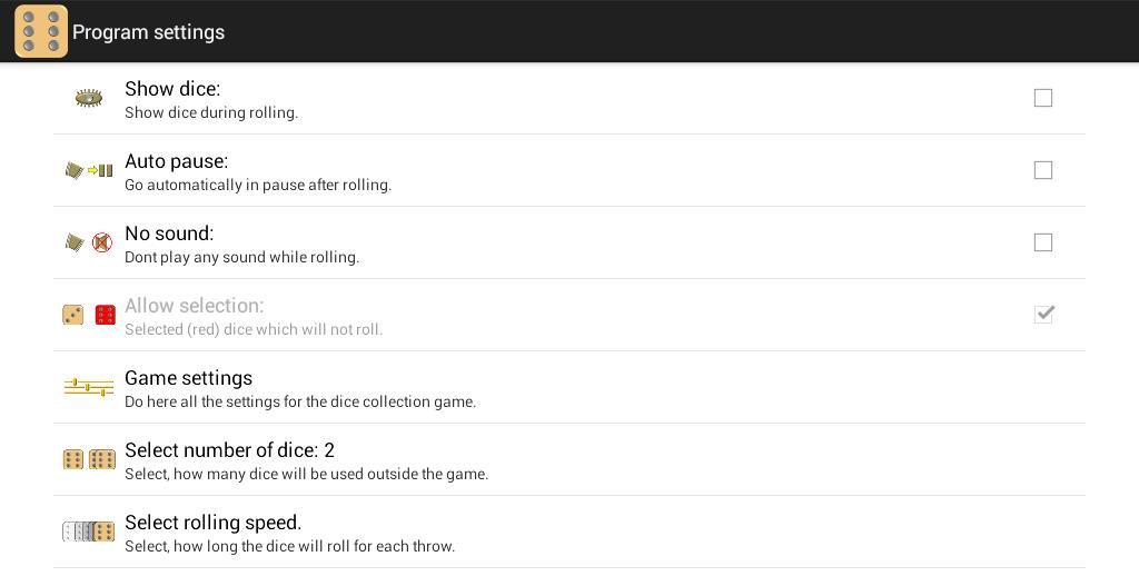 Avec ce programme, vous pouvez simplement laver les dés, les rouler en mode caché ou vous pouvez jouer à un jeu de collection. Cela peut être fait avec jusqu'à 6 dés. Le jeu est Completeley configurable (quelles combinaisons de dés peuvent être sélectionnées, combien de points sont fournis pour quelle combinaison et combien de lancers pour chaque tour sont autorisés). Le jeu peut être joué avec jusqu'à 6 joueurs (sur un appareil) - mais ici une tablette est recommandée - sur un téléphone, le jeu est généralement joué en un seul mode. Un bouton de réinitialisation vous permet de mettre les paramètres aux valeurs par défaut